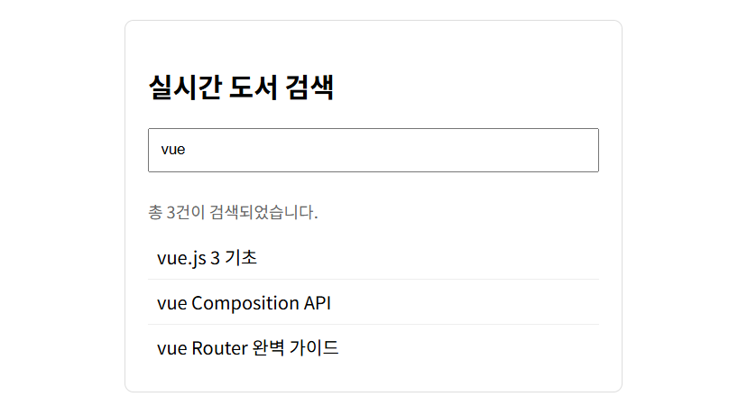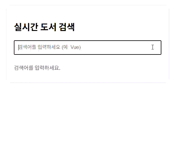 이벤트 루프와 setTimeout의 원리를 이해했다면, 실무에서 자주 쓰이는 검색어 자동완성(디바운싱) 로직도 완벽하게 해석할 수 있습니다. 아래는 Vue.js로 구현한 실시간 도서 검색 예제 코드입니다.