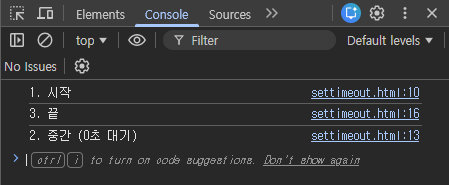위 코드를 실행하면 결과는 어떻게 될까요? 직관적으로는 “대기 시간이 0초니까 바로 실행되겠지?”라고 생각하여 1 -> 2 -> 3을 예상하기 쉽습니다. 하지만 실제 결과는 다음과 같습니다.