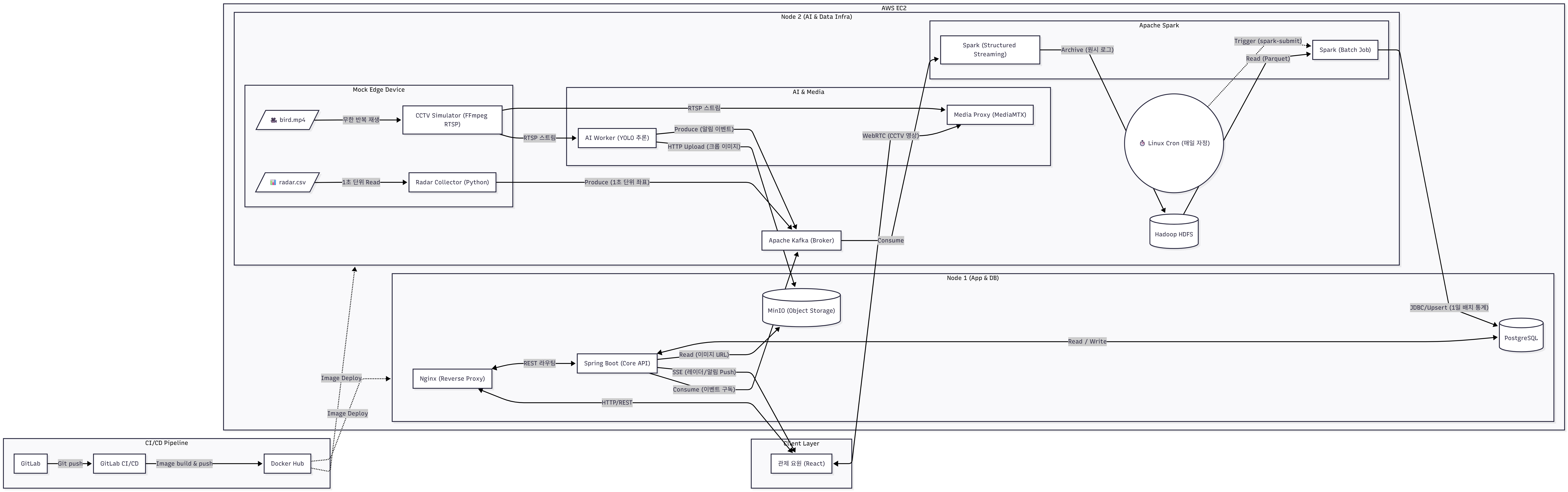 | Node 2 (AI & Data Infra) | 가상 엣지, AI 워커(YOLO), Kafka, Spark, Hadoop | CPU·Memory 집중 연산 전담 |