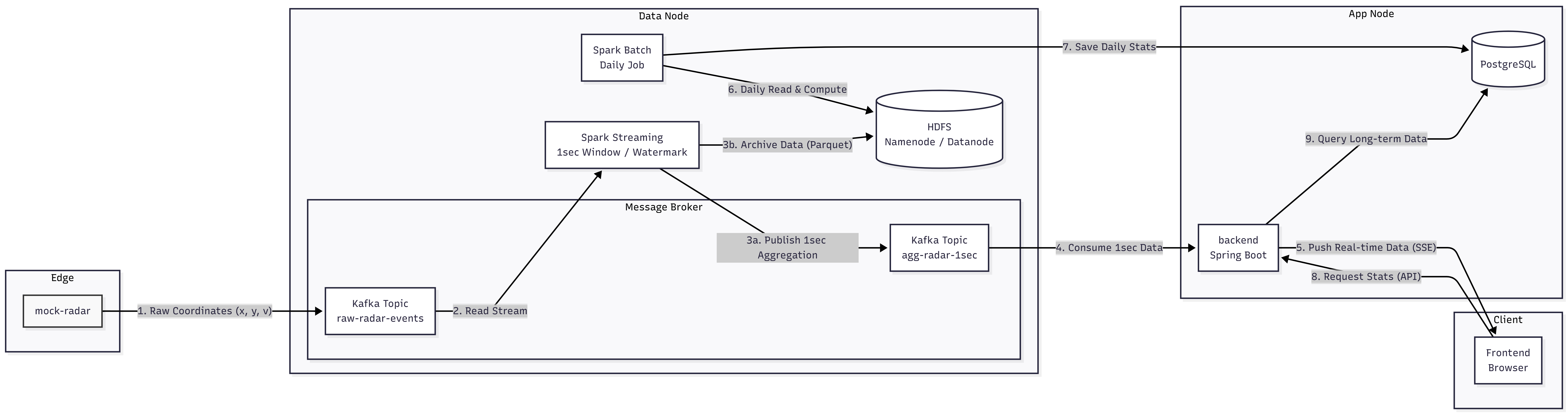 kafka토픽(agg-radar-1sec)에 발행하며,backend가 이를 구독하여 SSE를 통해 프론트엔드 관제 화면에 뿌려줍니다. (RDBMS 저장은 철저히 배제됩니다). - 보관용: 동시에 Spark는 원시 데이터와 1초 집계 데이터를 Data Node의
