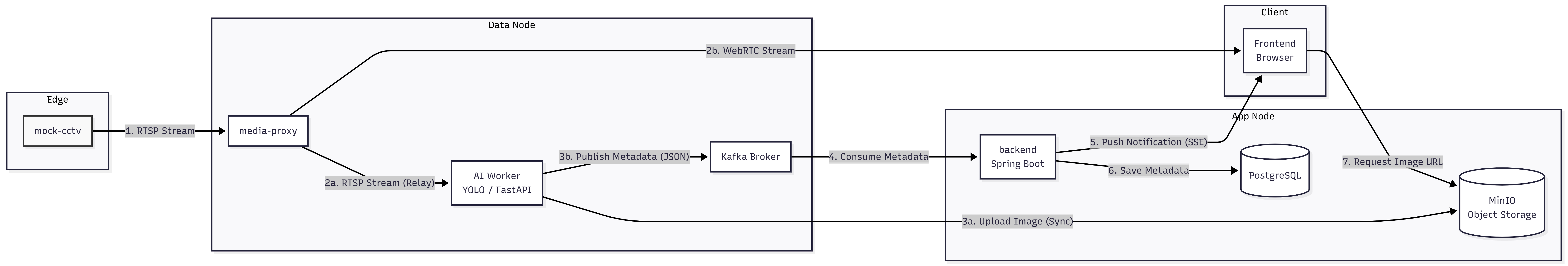 우리 시스템은 엣지 디바이스의 부하를 최소화하기 위해 media-proxy를 스트림 분배기(Distributor)로 활용하는 구조를 채택했습니다. Mock CCTV(엣지)가 media-proxy로 단일 RTSP 스트림을 쏘면(Push), 프록시가 이를 받아 AI 워커와 프론트엔드로 각각 중계(Relay)합니다.