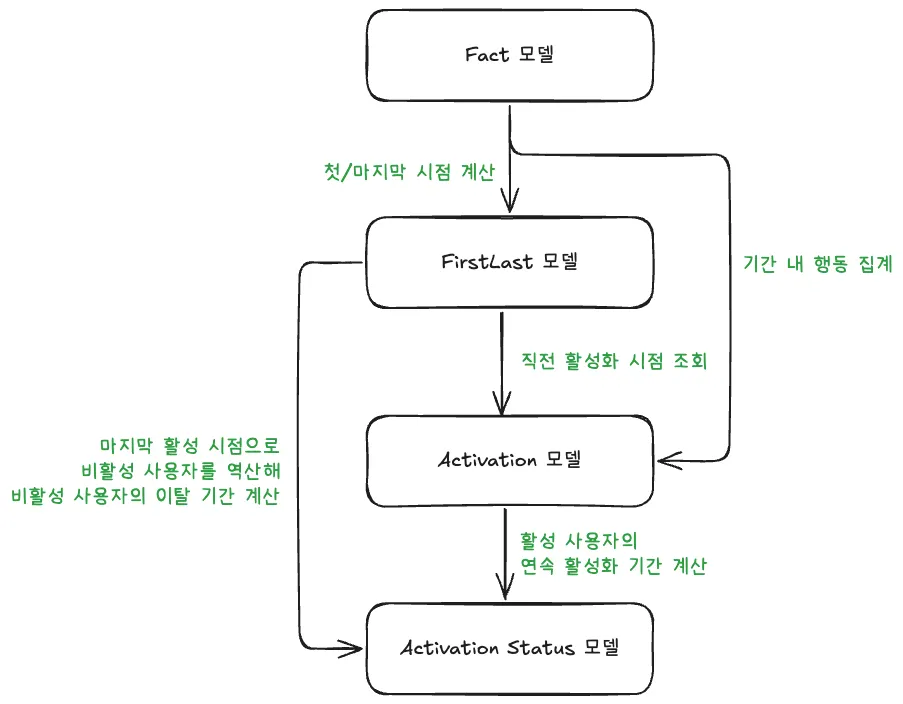 FirstLast 모델 (비용 최적화): 유저의 최초 활동일(First)과 마지막 활동일(Last)만 따로 관리하는 중간 테이블이다. 이를 통해 매번 전체 기간의 방대한 로그를 스캔하는 비용을 획기적으로 줄였다.
