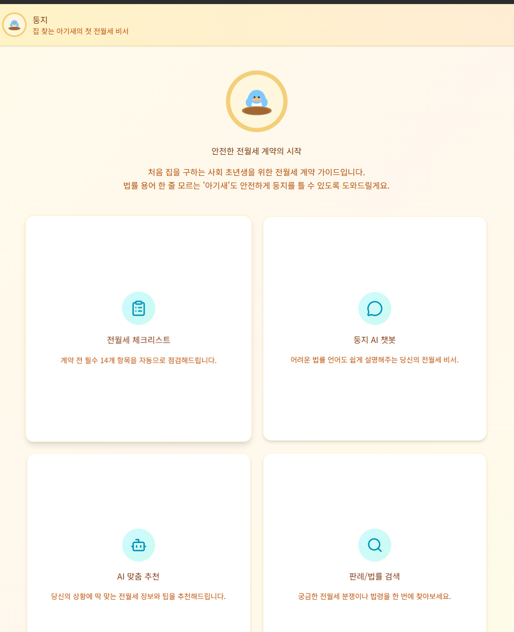 '집 찾는 어미새' 컨셉에 맞춰 Figma Make를 활용해 둥지 프로젝트의 UI/UX 프로토타입을 제작하고 디자인을 고도화한 과정입니다.