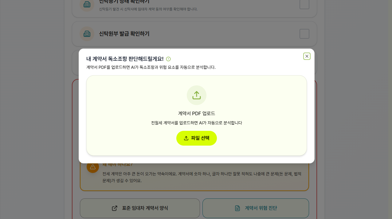 특히 신경쓴 부분은 ‘아무것도 모르는 사회초년생들이 주택 계약할 때 이것만 보고 따라와도 중간은 갈 수 있게 해주자’는 서비스 기획 의도를 반영하는 것이었다. 그래서 체크리스트 항목을 설명하는 부분에 ‘중1 수준의 WHAT (이 체크리스트가 무슨 내용인지), WHY (왜 이걸 해야 하는지)’ 설명을 추가하고 생소한 용어 같은 경우는 챗봇에게 바로 물어볼 수 있는 UX를 고안했다.