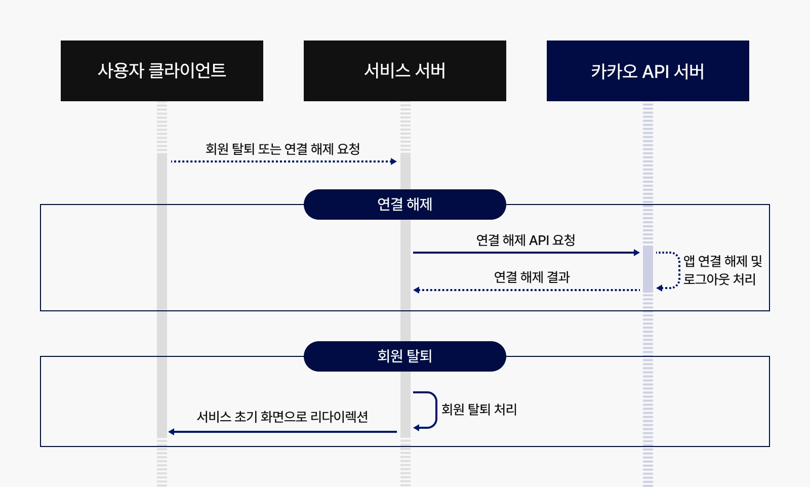 카카오는 서버 사이드에서 Admin Key를 이용해 제어할 수 있습니다. 유저의 access_token이 없어도 DB에 저장된 social_id만으로 강제 연동 해제가 가능하여, 세 프로바이더 중 가장 깔끔한 플로우를 가집니다.