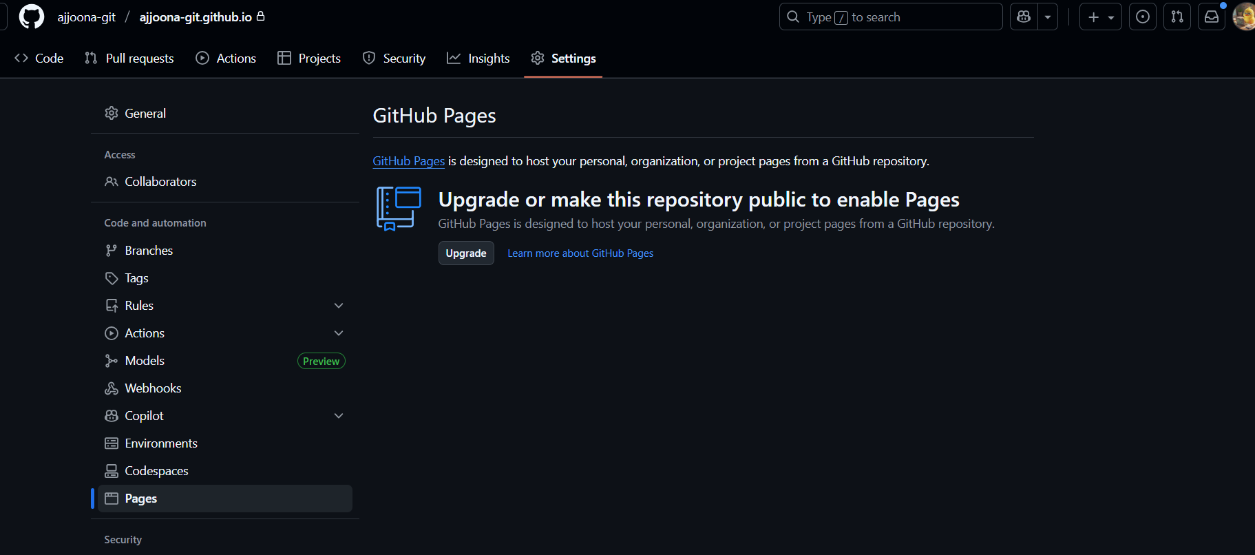 Private(비공개) 저장소에서 GitHub Pages를 사용하려면 GitHub Pro (유료) 플랜으로 업그레이드해야 한다고 한다.