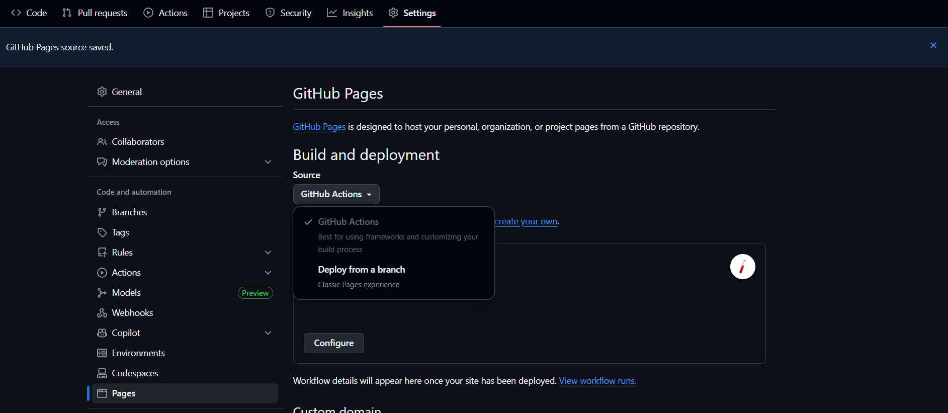 이를 해결하기 위해, GitHub 저장소 설정에서 “GitHub Actions”를 배포 소스(Source)로 지정해야 한다.