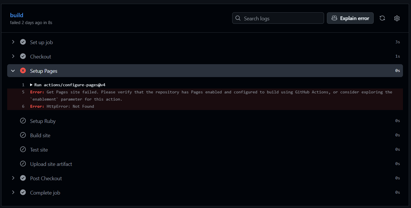 오류 메세지 Get Pages site failed. Please verify that the repository has Pages enabled...를 보아하니, 페이지 설정을 가져오지 못해 발생한 오류인 것 같다.