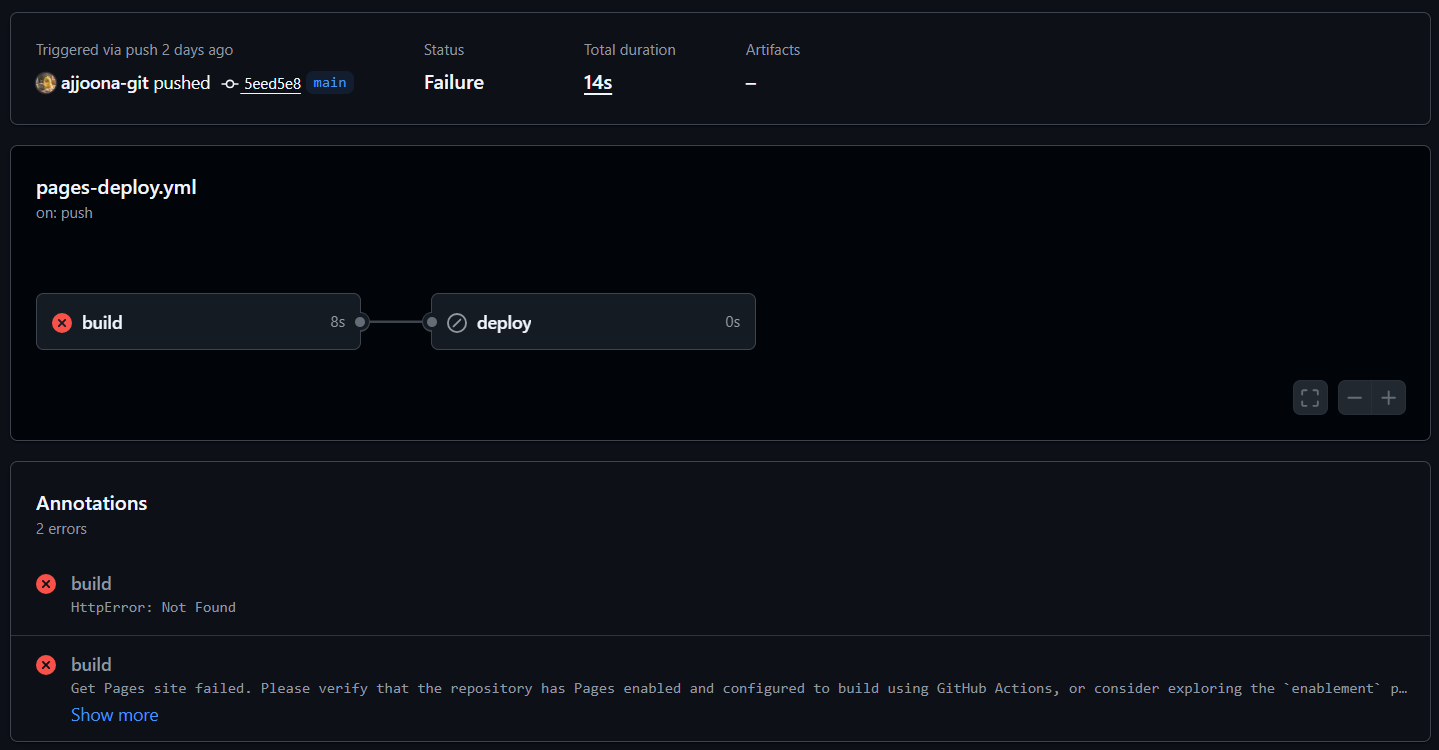 pages-deploy.yml 워크플로우는 “GitHub Actions”를 사용해 사이트를 빌드하고 배포하도록 설정되어 있다. 하지만 GitHub 저장소의 ‘Settings’가 “GitHub Actions”를 사용하도록 설정되어 있지 않아, 액션이 페이지 설정을 가져오지 못해(Not Found) 실패한 것이라고 한다.