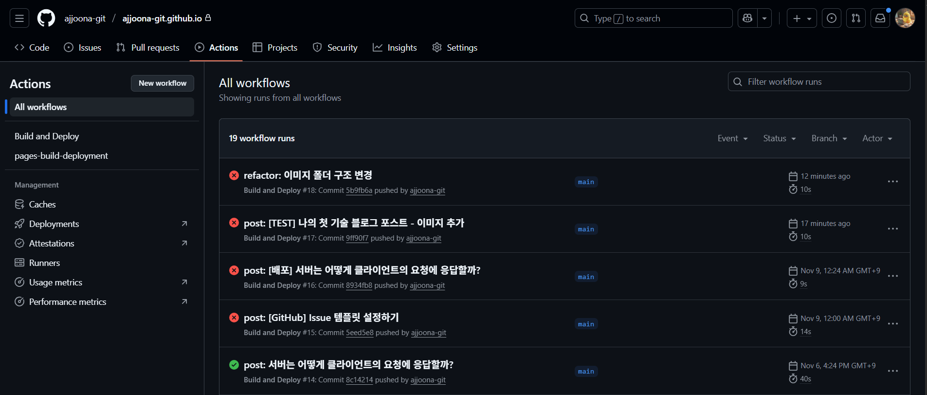 workflows를 보니 #15 “post: [GitHub] Issue 템플릿 설정하기” commit부터 빨간색으로 Build and Deploy 실패 표시가 되어있다. 자세히 알아보자.