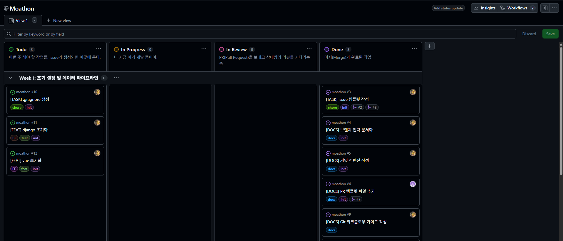 - Pull request opened → Status: In Review (PR을 열면 자동으로 리뷰 단계로 이동)