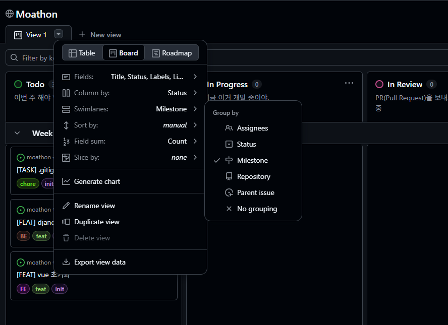 + New field말고, 이미 있는 시스템 필드 중 Milestone을 켜거나, GitHub Project는 기본적으로 연동되므로 뷰 설정을 본다. - 보드 화면에서 View 1 옆의 화살표(▼)를 누르고 Swimlanes의 Group by를 Milestone으로 바꾼다.
