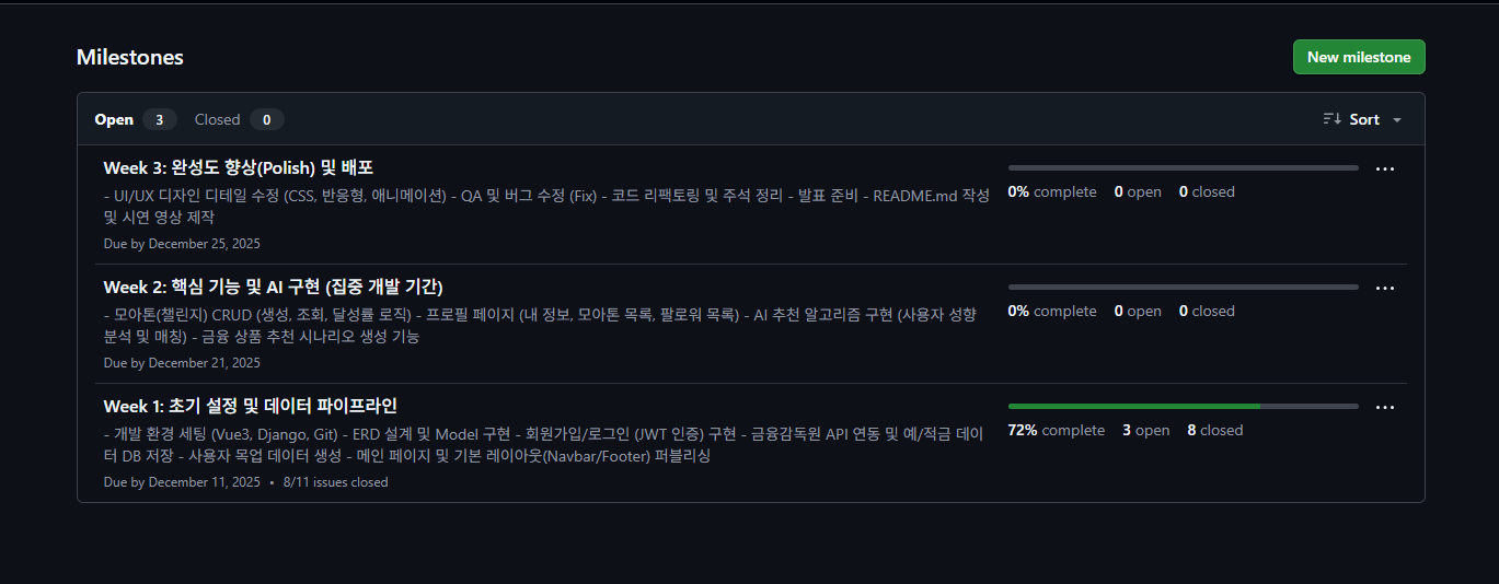 이제 Todo/In Progress가 마일스톤 별로 층층이 나뉘어서 보여서 일정을 한눈에 볼 수 있다.