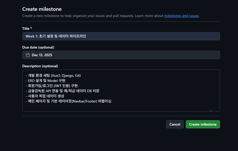 이제 New Milestone 버튼을 통해 마일스톤을 생성할 수 있다.