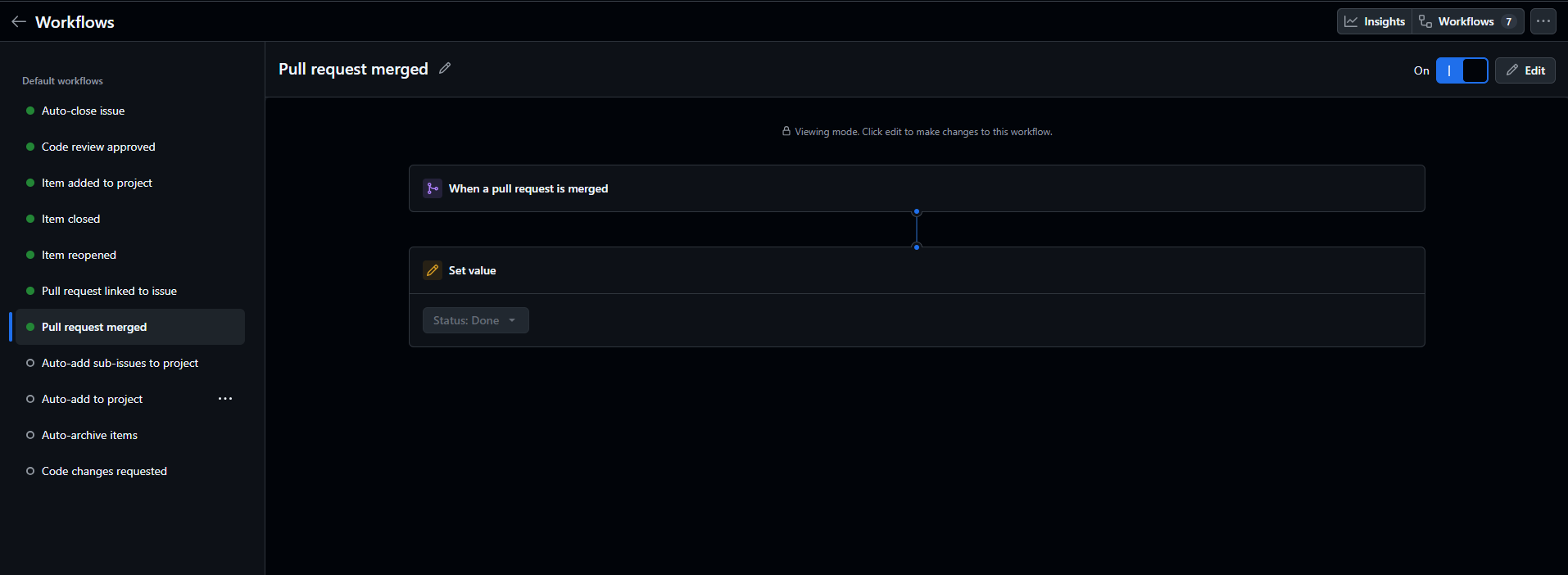 GitHub Projects 설정(Workflows 탭)에서 간단한 자동화를 걸어둘 수 있다. Workflows 탭은 우측 상단에서 확인할 수 있다.