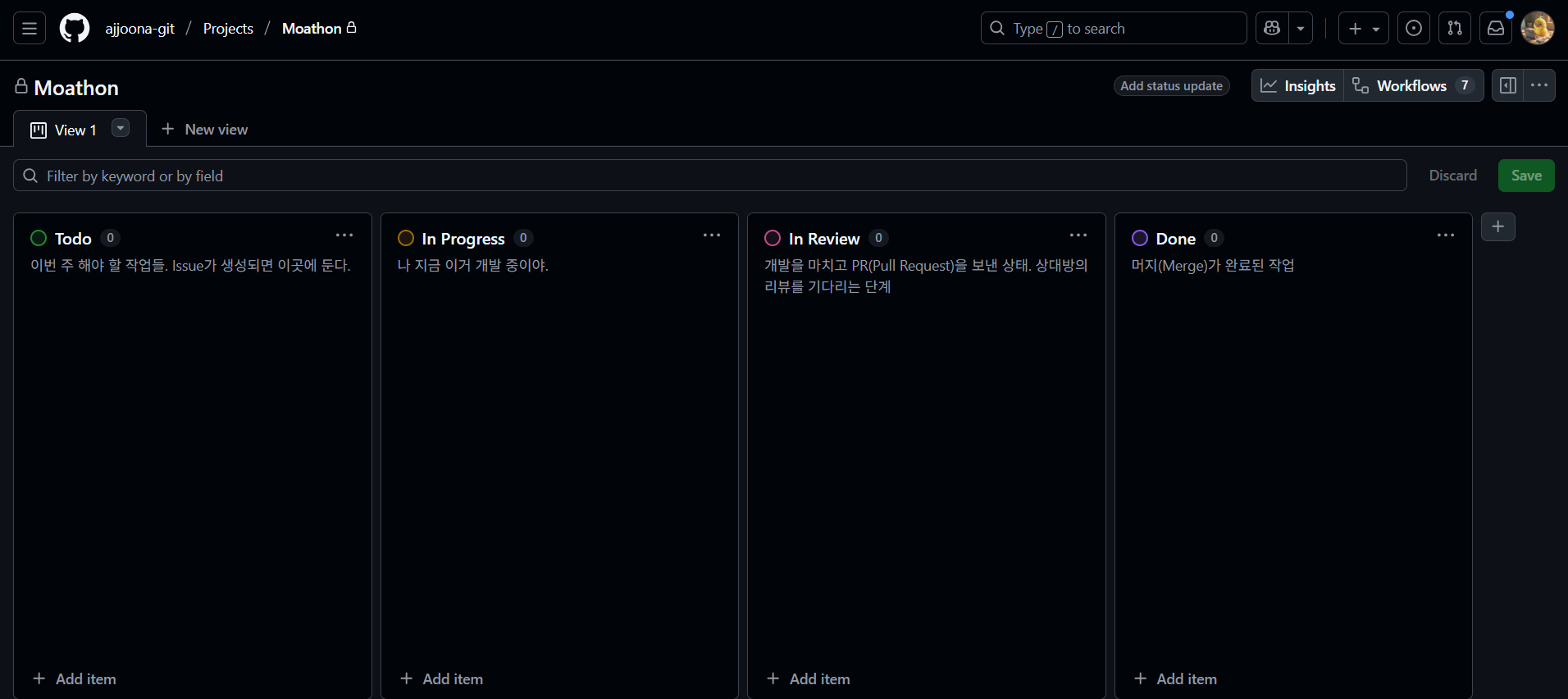 레포지토리 상단의 Projects 탭에서 New Project를 클릭한다. 템플릿은 ‘Board’로 하고 이름은 서비스명인 ‘Moathon’으로 정했다.