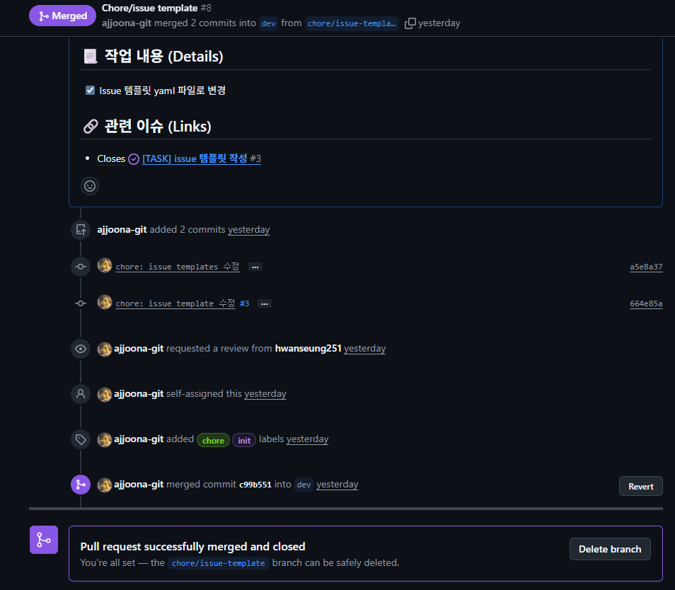 관련 이슈번호를 Closes와 함께 작성하면, PR이 merge되고 Close되면 자동으로 언급한 이슈가 Close된다. 즉, 이슈 생성 - 작업 후 커밋 - PR 생성 - 팀원 리뷰 및 승인 - [ PR Merge - PR Close - 이슈 Close ] 순서로 이루어진다. 그리고 [ PR Merge - PR Close - 이슈 Close ] 해당 과정이 자동화되는 것이다.