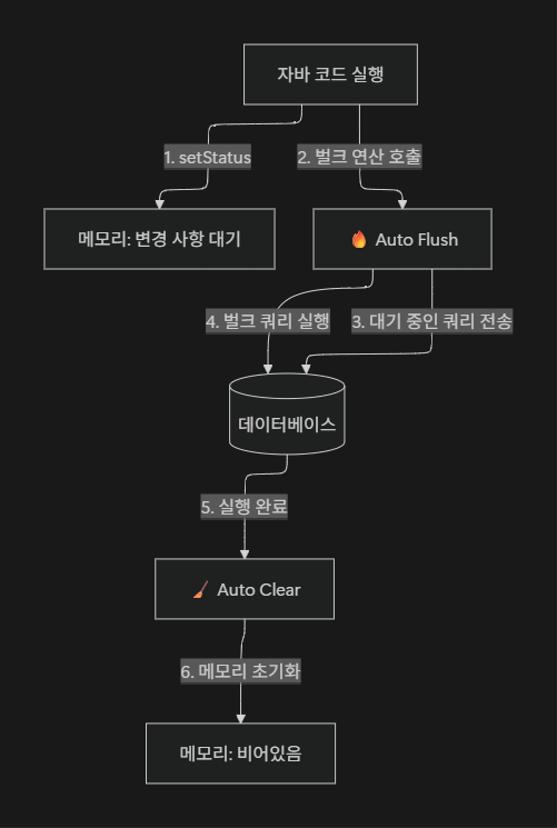 그런데 벌크 연산(Bulk Operation)은 이 규칙을 깬다. @Query("UPDATE ...")로 작성된 JPQL은 메모리를 거치지 않고 DB에 바로 쿼리를 날려버린다.