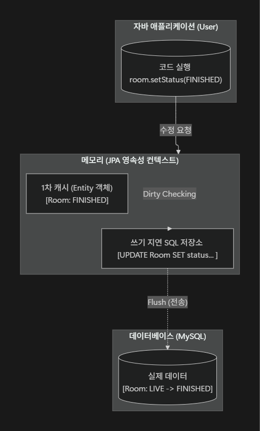 room.setStatus(FINISHED)같은 변경 감지(Dirty Checking) 코드는 트랜잭션이 끝날 때(commit 시점) DB에 반영된다. 즉, 테스트 도중에는 DB에 반영되지 않고 메모리에만 떠 있는 상태가 된다.