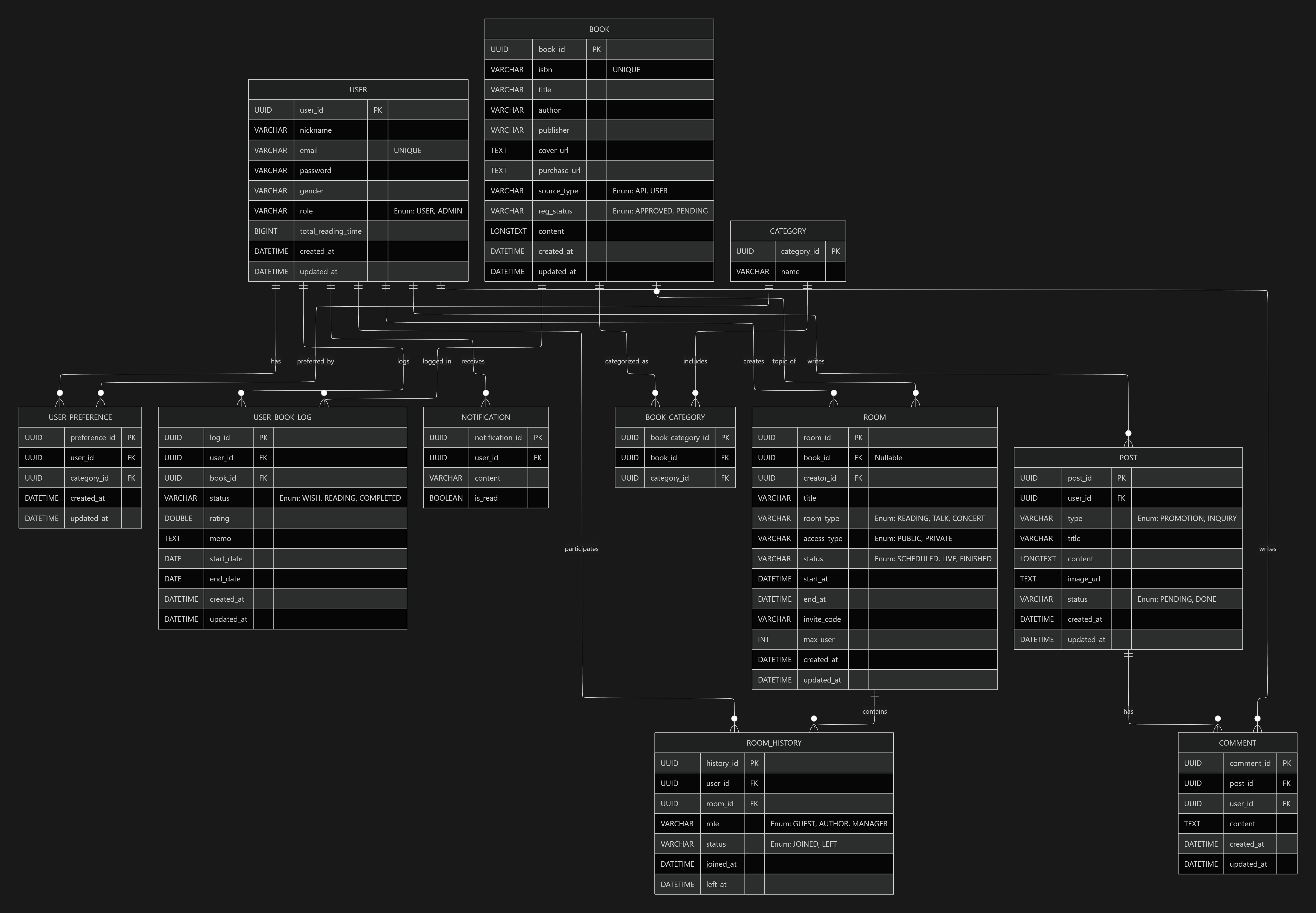 단일 테이블 전략(Single Table Strategy)으로 변경하고, 모든 방을 ROOM 테이블 하나로 통합했다. 여기에 room_type (Enum: READING, TALK, CONCERT) 컬럼으로 층을 구분한다. 3층에만 필요한 invite_code나 4층에 필요한 book_id 같은 필드는 Nullable로 두어 유연하게 대처했다.