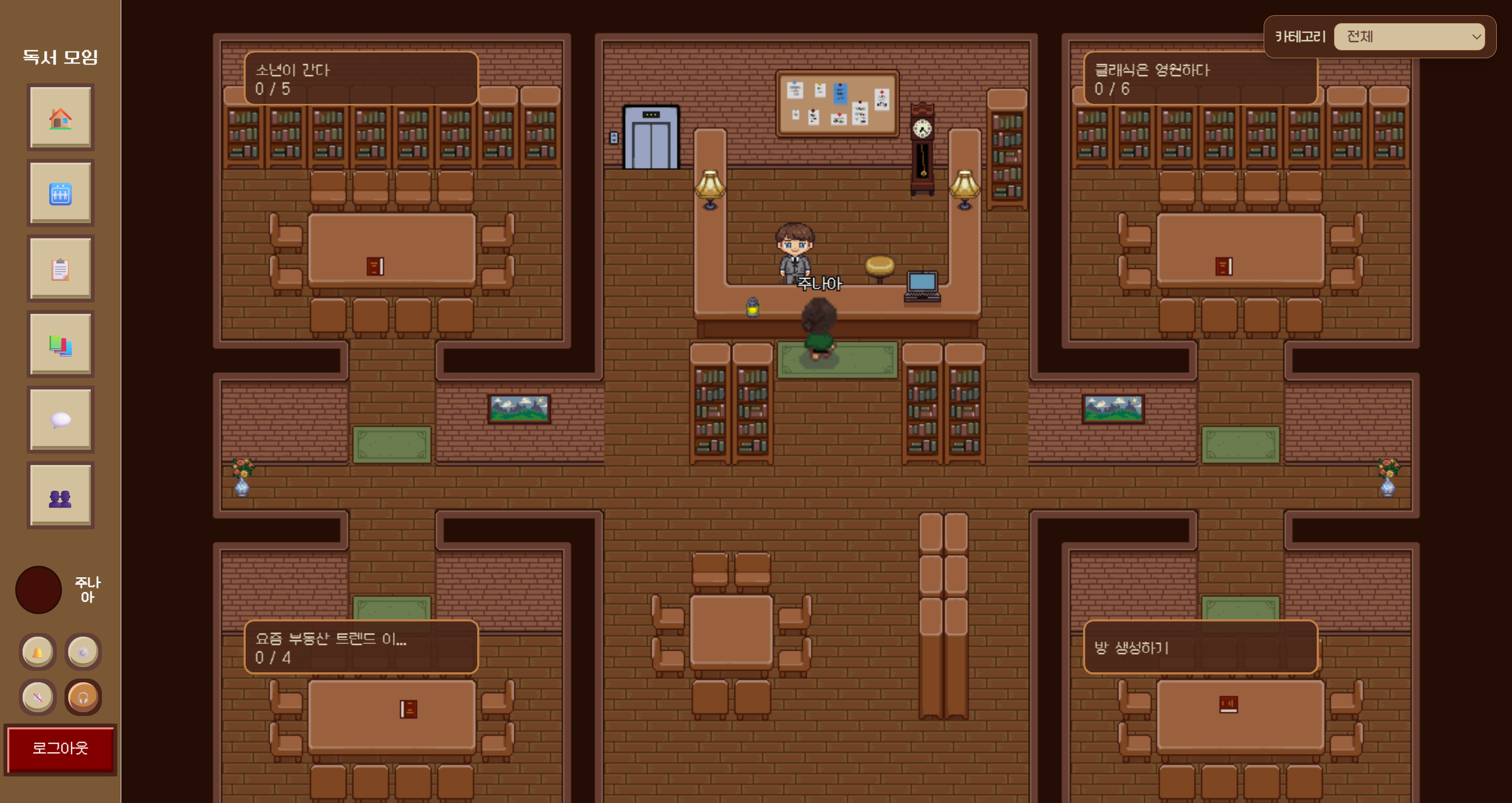 Room엔티티 내부에 핵심 비즈니스 메서드를 구현했습니다.join(): 현재 인원을 체크하고 증가시키는 메서드. 인원이 꽉 찼으면 예외를 던집니다.updateInfo(): 제목, 인원, 책 등의 정보를 수정하는 메서드. 특히 “책이 변경되면 카테고리도 변경된다”는 연관 관계 규칙을 이 메서드 안에 캡슐화했습니다.