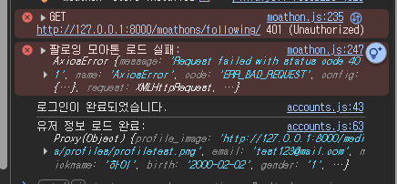 /moathon/following/요청에 대해401 Unauthorized에러 발생. - 페이지를 새로고침(F5) 하면 그제야 정상적으로 데이터가 로드됨.