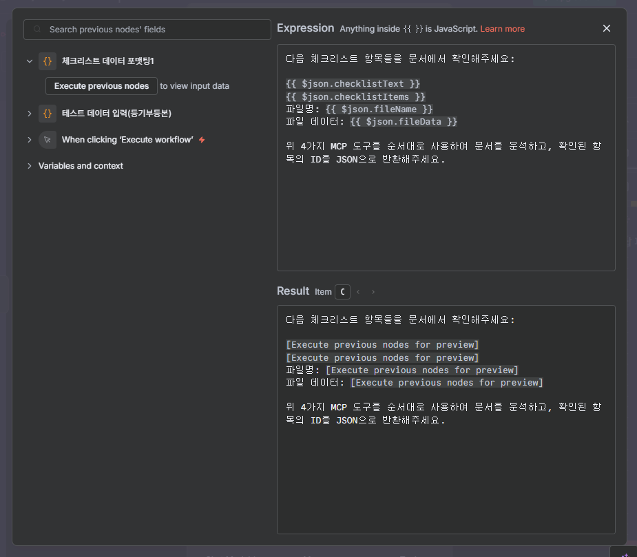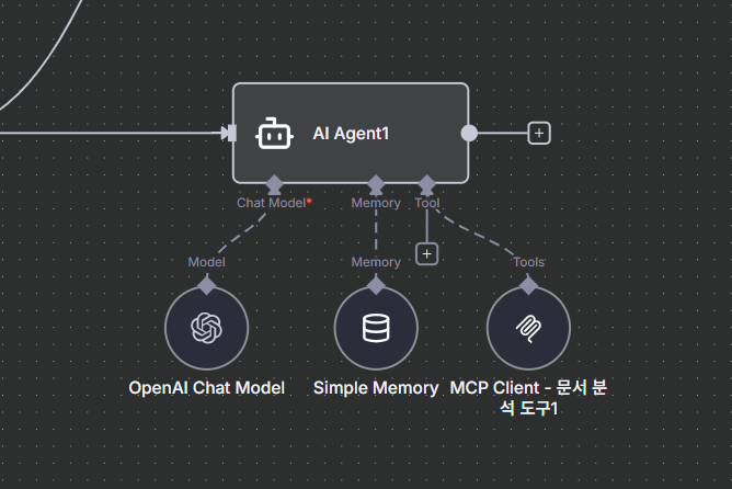 - 물리적 연결: 캔버스 상에서 MCP Client Node(또는 다른 툴 노드)를 AI Agent Node의