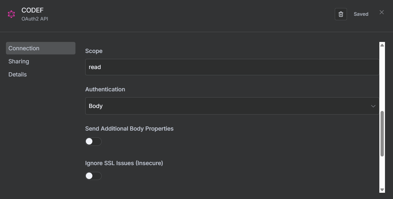 | Client Secret | CODEF 홈페이지에서 발급받은 Secret (환경변수 권장: ``) |
