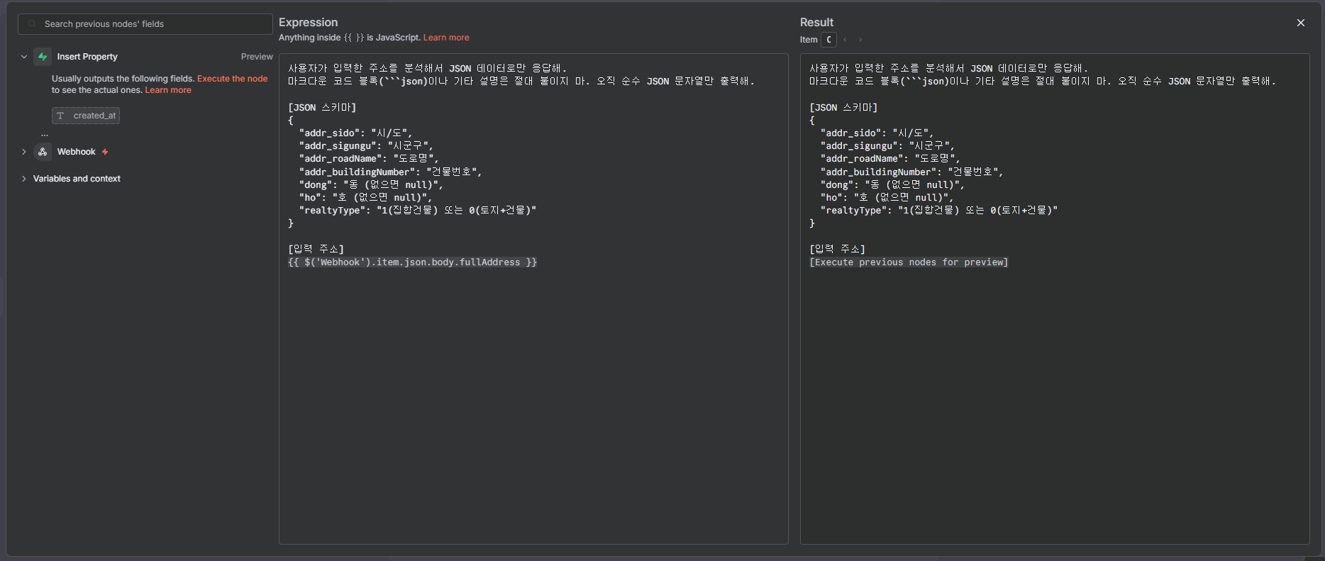 - 클라이언트가 n8n의 Webhook URL로 주소 데이터를 전송한다 (POST 요청).