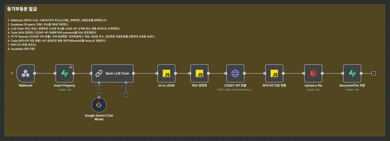 Webhook (수신) → AI Agent (주소 파싱) → Code Node (RSA 암호화) → HTTP Request (CODEF API) → Database (저장)