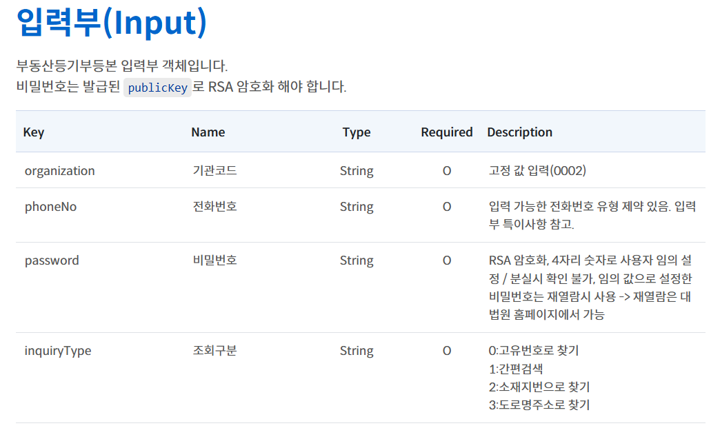 dong) & 호 (ho): 아파트나 다세대 주택(집합건물,realtyType=1)인 경우 필수이다.- Tip: 사용자가 주소를 입력할 때 ‘다음 주소 API’ 같은 서비스를 연동하여 위 데이터를 분리해서 받는 것이 정확도를 높이는 길이다.