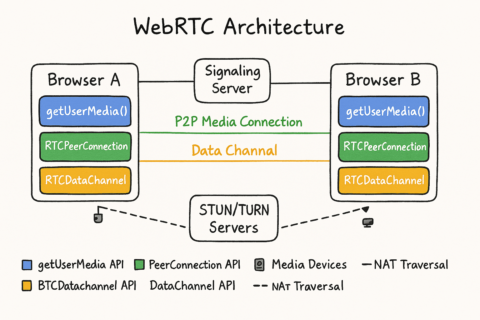 - 주선자 (Signaling Server): 철수(A)와 영희(B)는 서로 연락처를 모른다. 철수가 주선자에게 “영희랑 통화하고 싶어, 내 번호는 010-XXXX야”라고 쪽지를 준다.