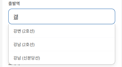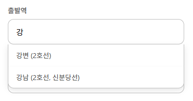 사용자가 출발역이나 도착역을 입력할 때, 전체 역 이름을 다 치지 않아도 관련된 역 목록을 보여주는 자동완성 기능을 구현하였다. 이 기능은 사용자 경험(UX)을 개선하고 오타를 방지하는 데 목적이 있다.