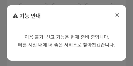 ‘이용 불가’ 액션 버튼을 누르면 신고할 수 있도록 하는 기능을 위한 요소로 남겨두었다. 다만 이 기능은 MVP에 포함되지 않아 껍데기뿐인 기능이다. 단순 alert 창에서 모달(Modal) UI로 변경하여 디자인 일관성 확보했다.