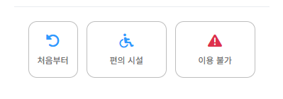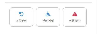 하단 액션 버튼(‘처음부터’, ‘편의 시설’, ‘이용 불가’)의 너비가 균등하지 않은 문제가 발생했다. ‘처음부터’ 버튼만 form 태그로 감싸져 있어 flex 속성이 제대로 적용되지 않았기 때문이다. 이를 해결하기 위해 컨테이너의 스타일을 display: flex에서 display: grid로 변경하고, 3등분(1fr 1fr 1fr)하여 공간을 균등하게 분배했다.