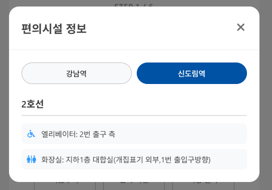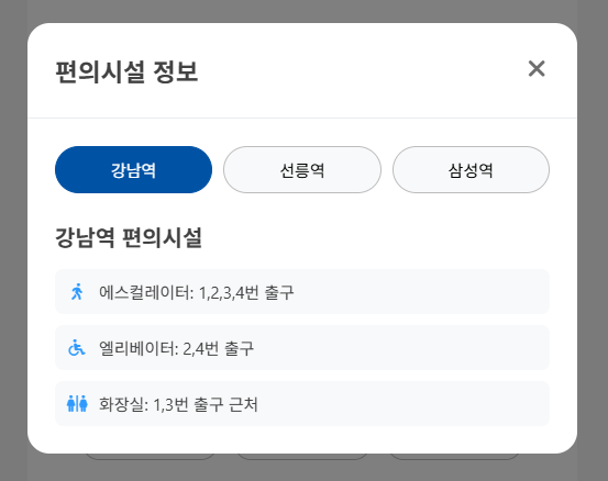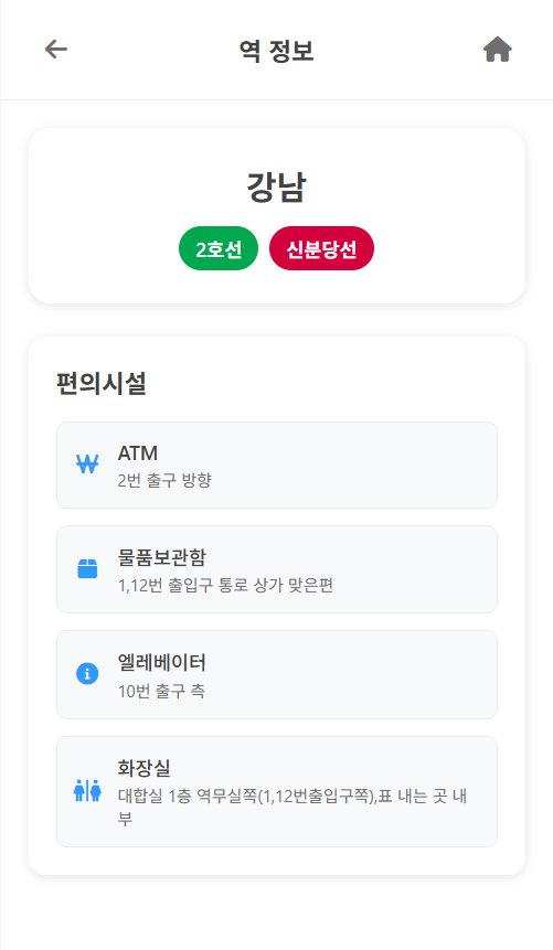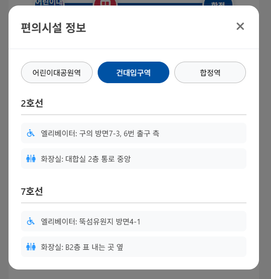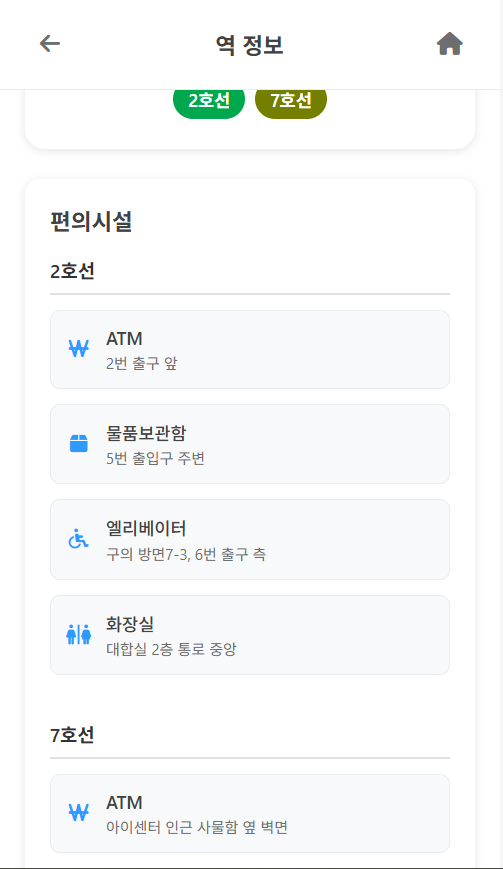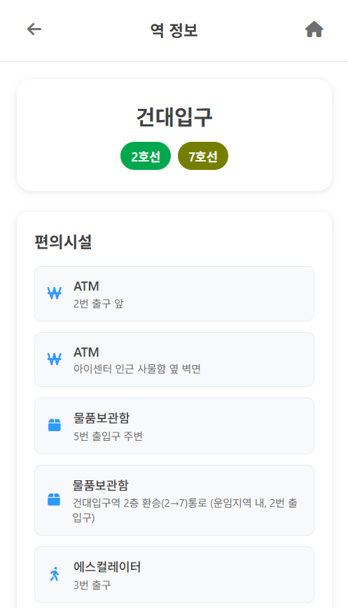 - 호선별 시설 정보 분리: 환승역 조회 시, 편의시설 정보가 섞이지 않고 호선별로 섹션이 나뉘어 표시되도록 로직 개선 (