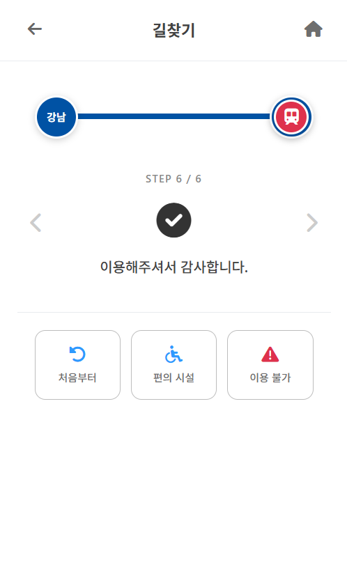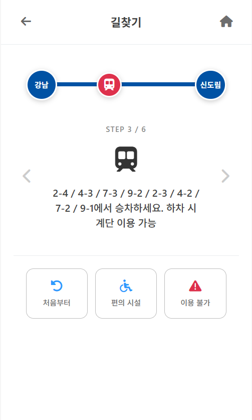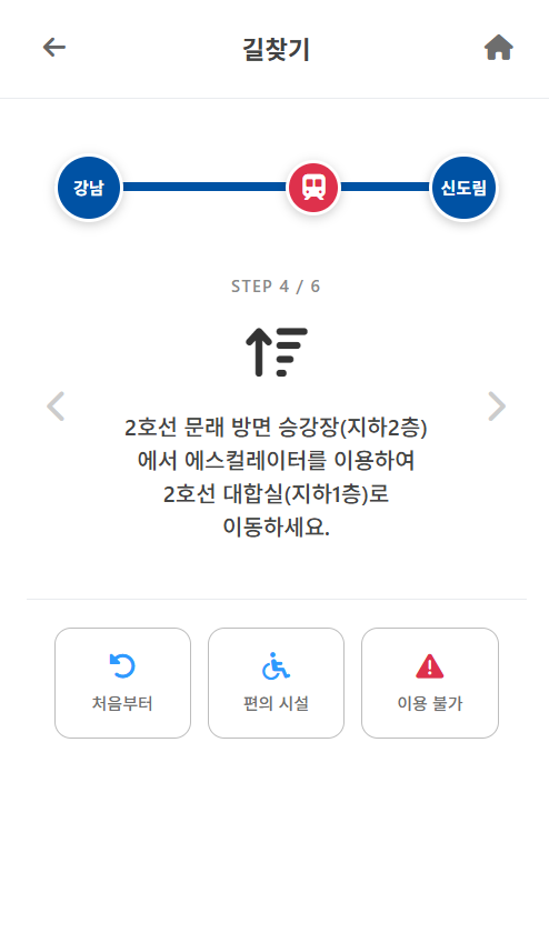 - 지시문 아이콘 시각화: 텍스트 분석 로직을 통해 이동 수단(에스컬레이터, 승차, 도보 등)에 맞는 아이콘을 동적으로 표시.